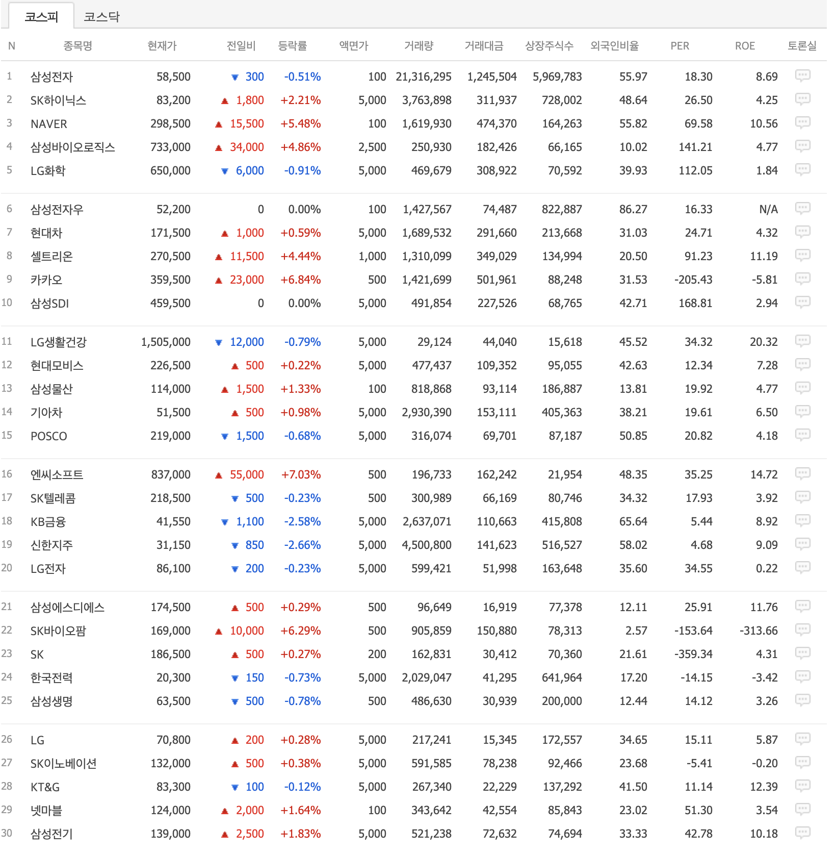 뭐 빅데이터 책으로 공부하다가 데이터도 긁어올겸 python으로 현재 네이버 주식 시가총액창에 있는 데이터를 긁어오는 코드를 짜봤다.